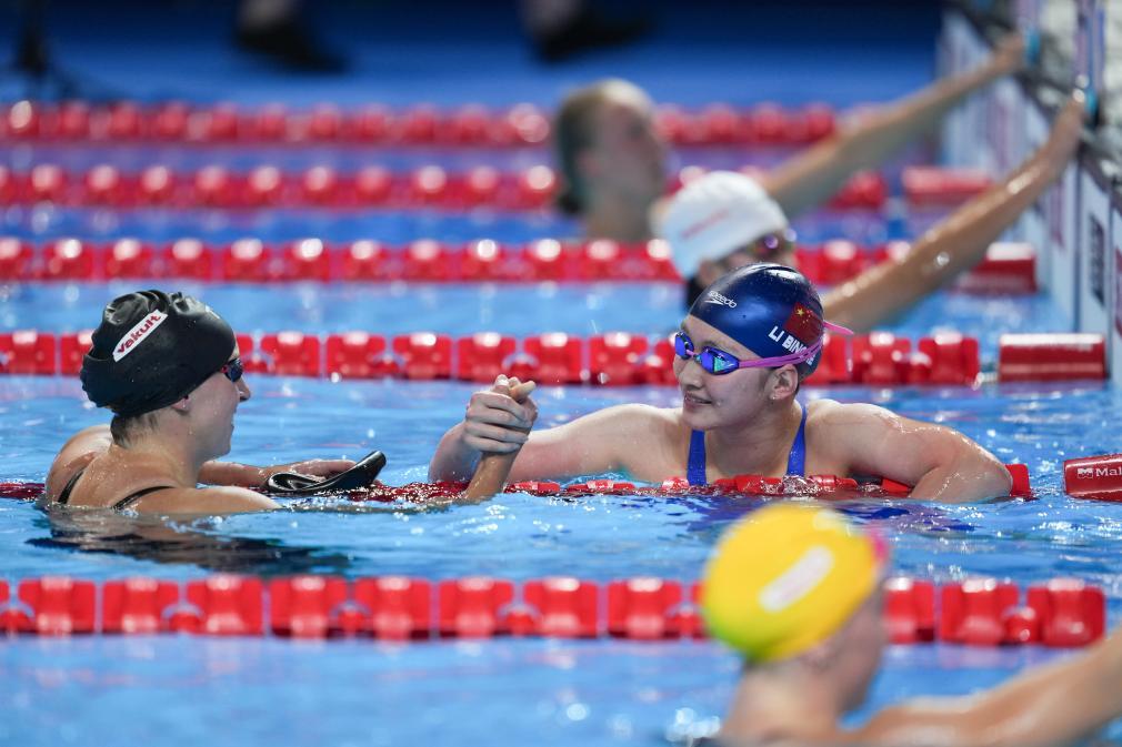 7月27日,中国选手李冰洁(右中)在比赛后与美国选手莱德茨基握手致意。当日,2025年世界游泳锦标赛女子400米自由泳决赛在新加坡举行。新华社记者 伍志尊 摄